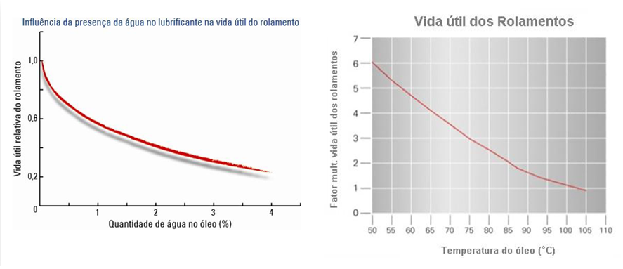 Este último tópico, merece especial atenção. A mistura com água resulta na diminuição da vida útil do óleo e danos para os equipamentos. Além de afetar diretamente a vida útil dos rolamentos, devido ao fato de estar comprometendo a qualidade da lubrificação, também provoca oxidação nas pistas externa e interna deles. Veja o gráfico abaixo: